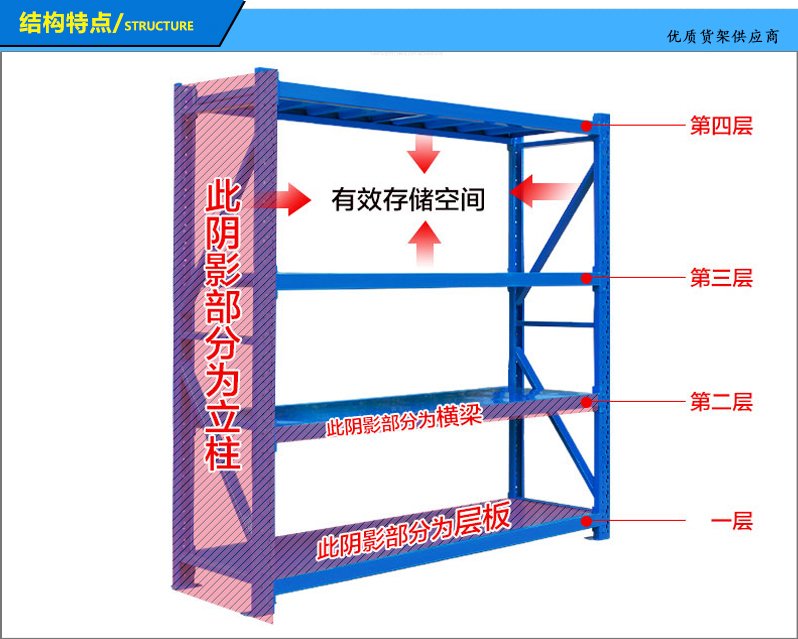 5、常用规格:L2000*D600*H2000mm,4层,每层铺钢层板或木层板。