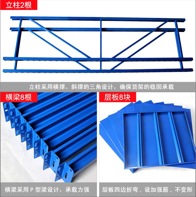 3、层板有木板和钢板可供选择,立柱高度设有每50mm调节孔距,可根据货物高低调节层间使用。