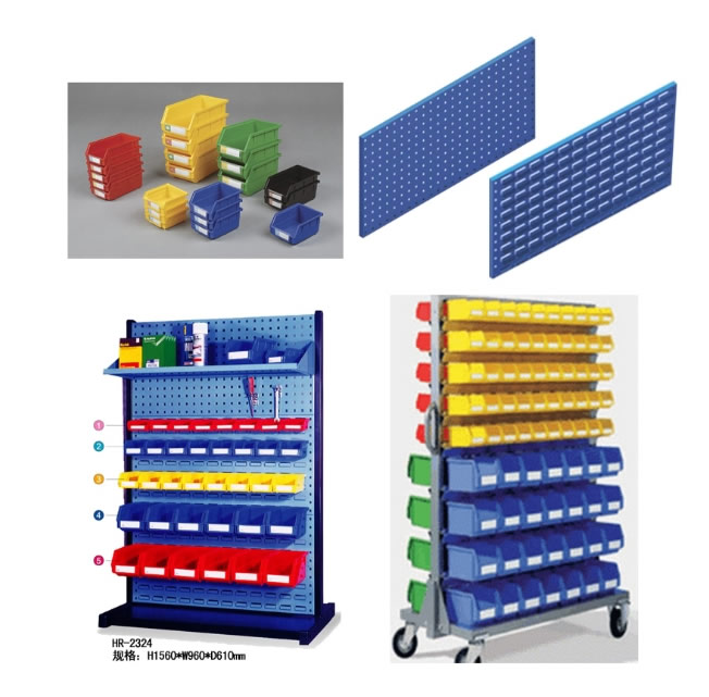 物料整理架物是以方孔挂板和百叶挂板为主要部件,结合背挂零件盒、挂钩、棚板等多种配件使用。对您生产现场的小型少量多样的工具、物料进行分类存放、方便搬运归位、充分利用空间,整洁高效。